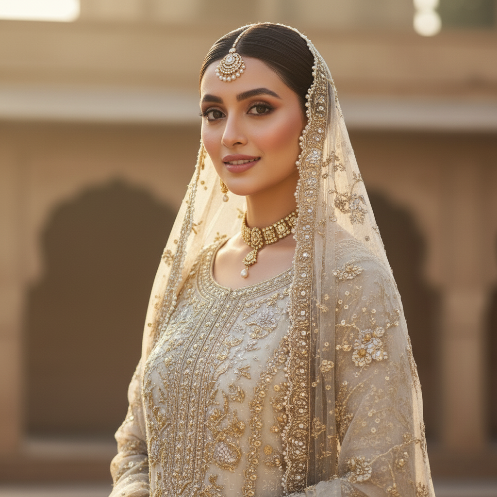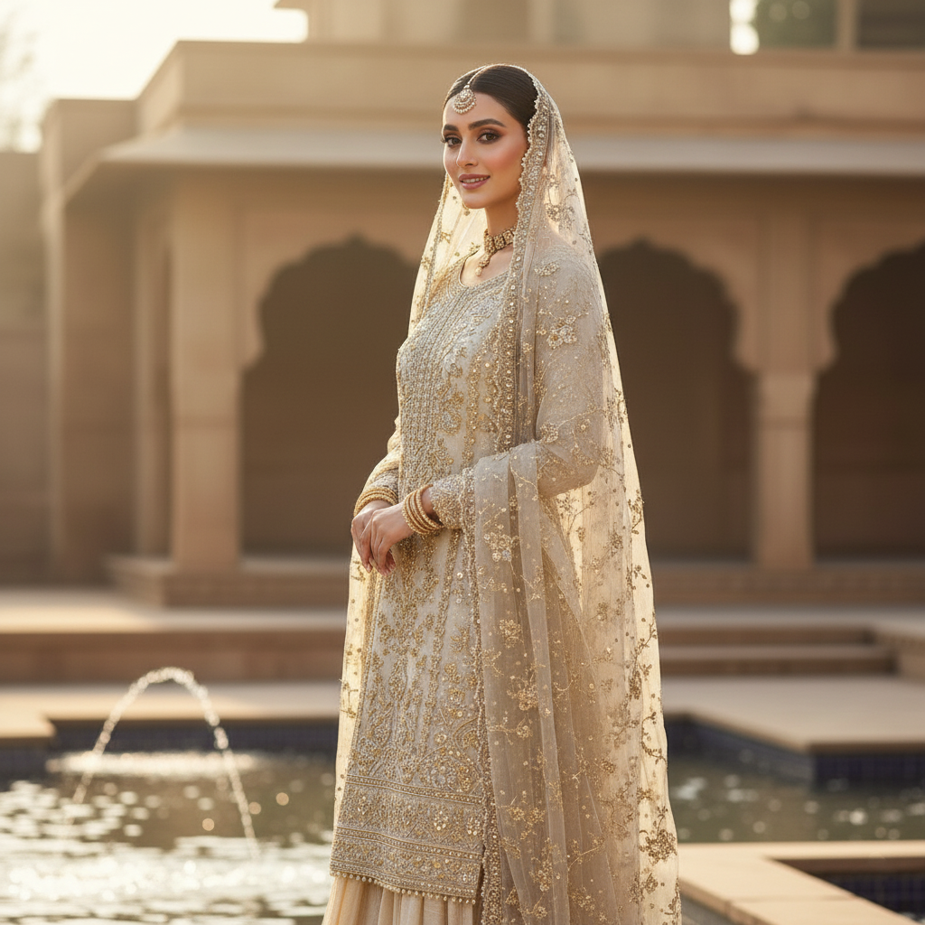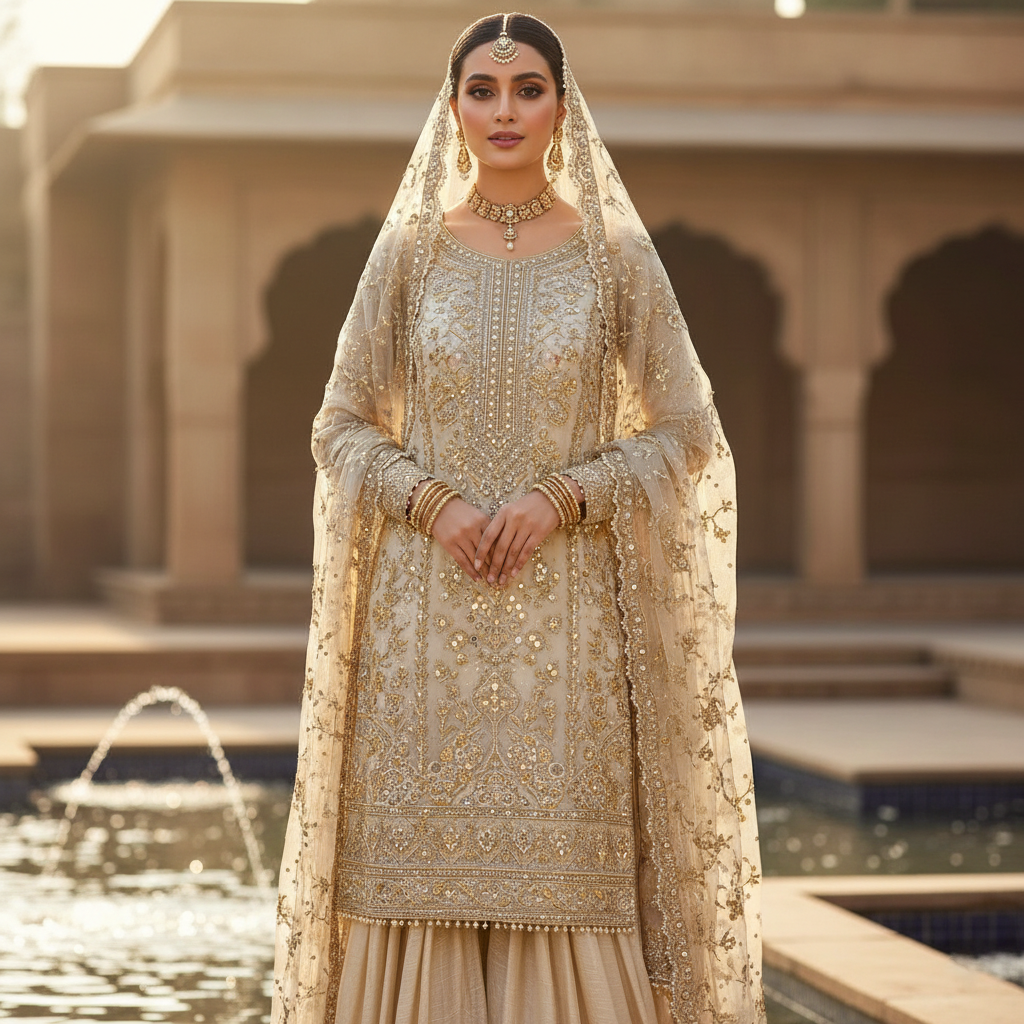 Elevate your occasion wardrobe with the Royal Radiance Formal Ensemble, a timeless blend of sophistication and traditional South Asian craftsmanship. Rendered in soft champagne gold and ivory tones, this outfit is designed for weddings, receptions, and grand celebrations where elegance is everything.
